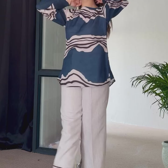 Top Fabric: Soft, breathable linen-blend with abstract wave patterns in navy & cream