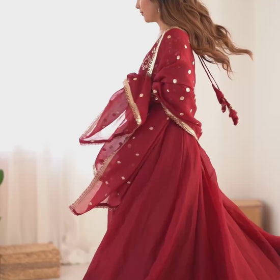 Turn heads in this stunning maroon Anarkali set, adorned with delicate golden embroidery and a flowy, sheer dupatta. A timeless pick for festive elegance and traditional charm.