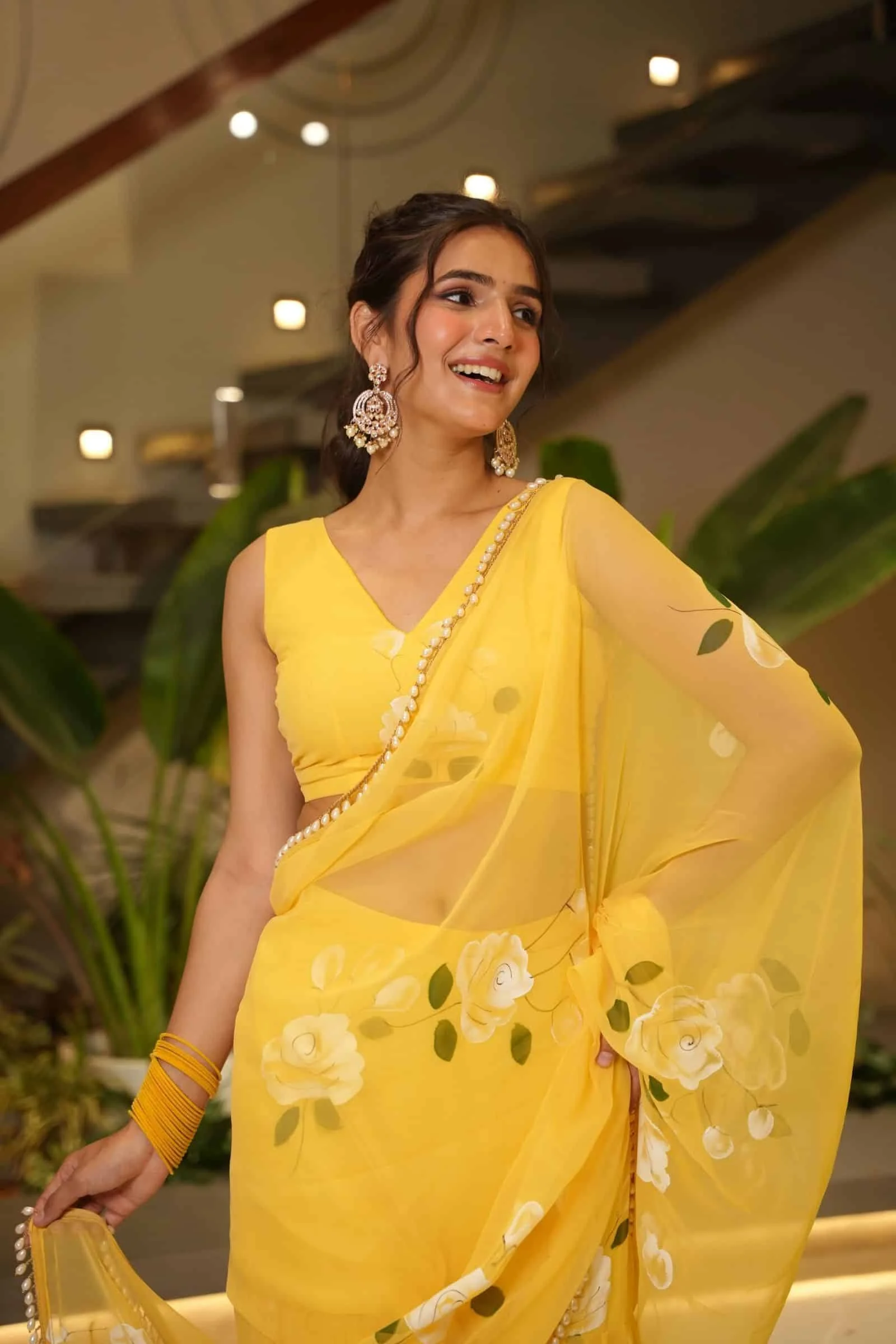 Brighten your look with this sunshine-yellow floral saree crafted in soft, flowy fabric. The white rose prints and pearl-detailed border add graceful charm, making it perfect for festive and daytime celebrations. Lightweight, comfortable, and beautifully flattering.